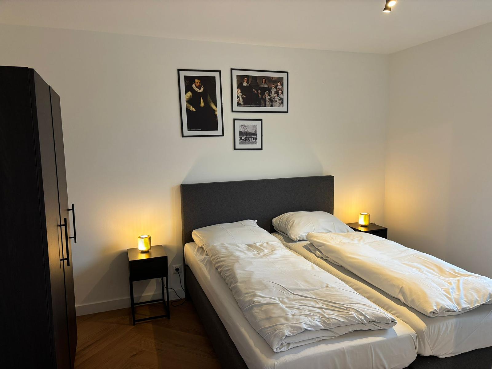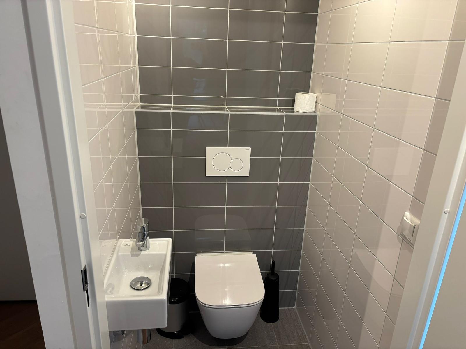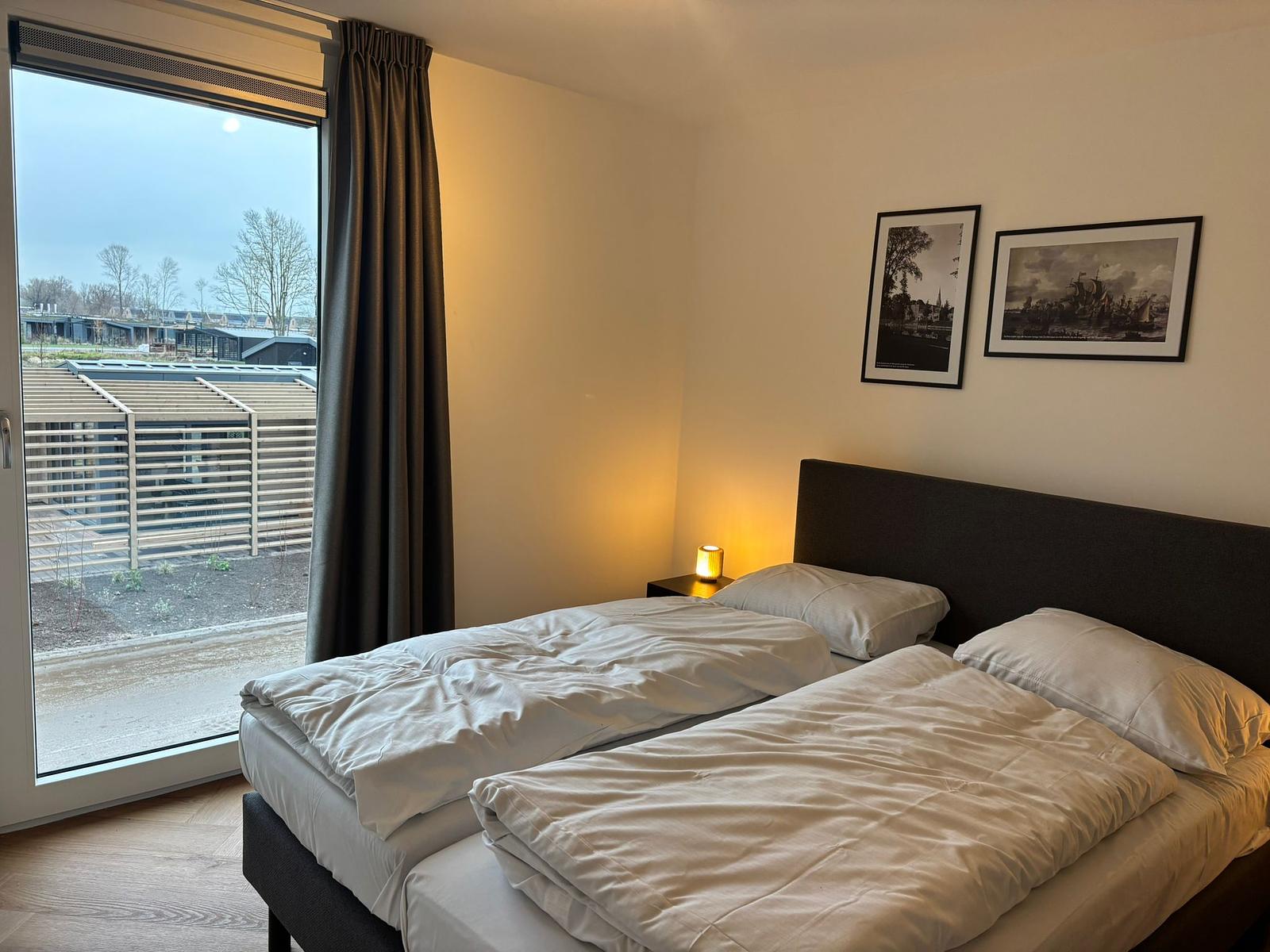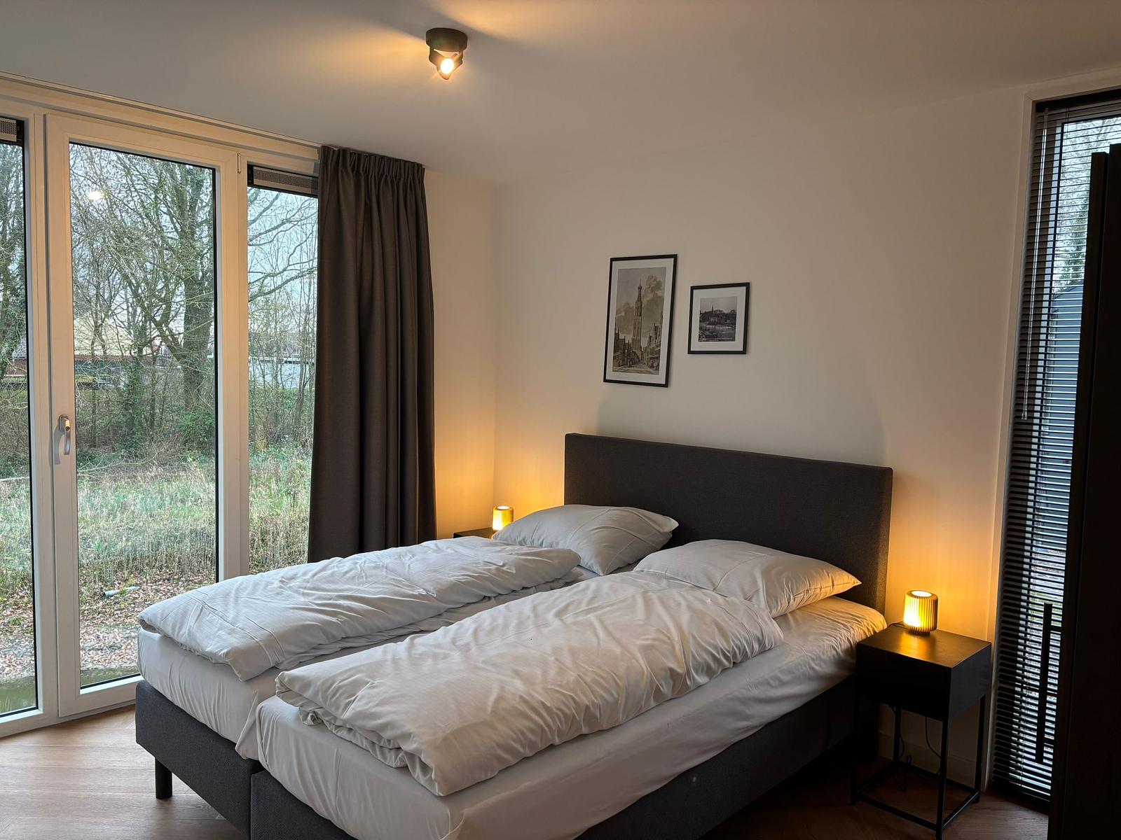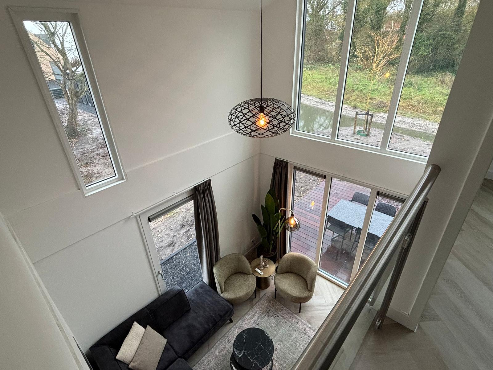 Op de begane grond vind je een ruime en hoge woonkamer met veel lichtinval, een gezellige zithoek met televisie, een eettafel en een moderne open keuken met koffiezetapparaat, vaatwasser en combimagnetron.