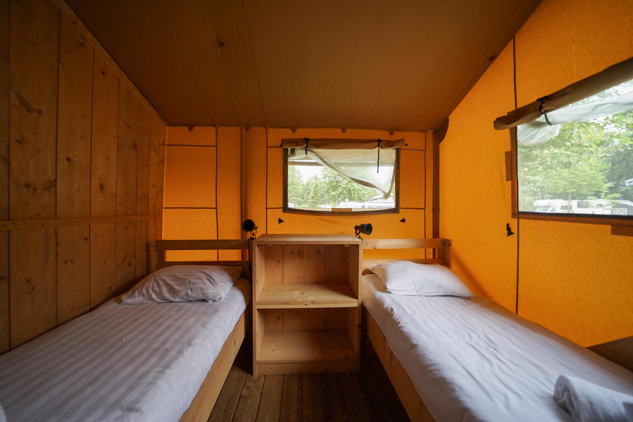 Lodgetent 6 is een ruime ingerichte safaritent die je dichterbij de natuur brengt en van alle gemakken is voorzien. De tent is gelijkvloers, geschikt voor 6 personen en kan betreden worden via enkele traptreden. In de gezamenlijke ruimte tref je een zithoek met televisie, eethoek en keuken met onder andere een koelkast, koffiezetapparaat en inductiekookplaat. De tent heeft 3 slaapkamers, waarvan 2 met 2 eenpersoonsbedden en 1 met een stapelbed. In de badkamer vind je een douche, wastafel en toilet. Buiten de ingang van de tent bevindt zich een overdekt en gemeubileerd terras. Je kunt gratis verbinding maken met de Wi-Fi en je kunt 1 auto parkeren bij de tent.